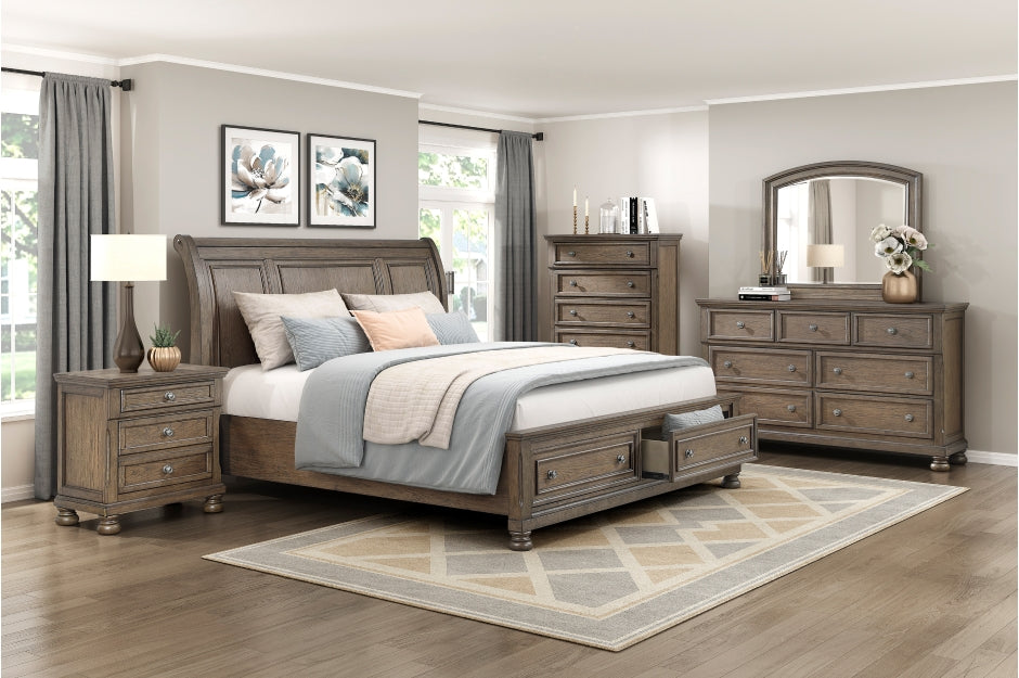 Elevate your bedroom with the Bedroom-Bethel Collection, blending timeless elegance and smart design. The wire-brushed antique brown finish complements the classic sleigh bed, complete with footboard storage drawers—no box spring needed. Crafted from durable birch veneer, wood, and engineered wood, this set offers fully assembled nightstands, dressers, and chests featuring dovetail drawers, smooth ball-bearing glides, and felt-lined trays for your valuables. Antique pewter-tone knobs and an arched dresser mirror add refined style and light, creating a sophisticated sanctuary tailored for both beauty and function.