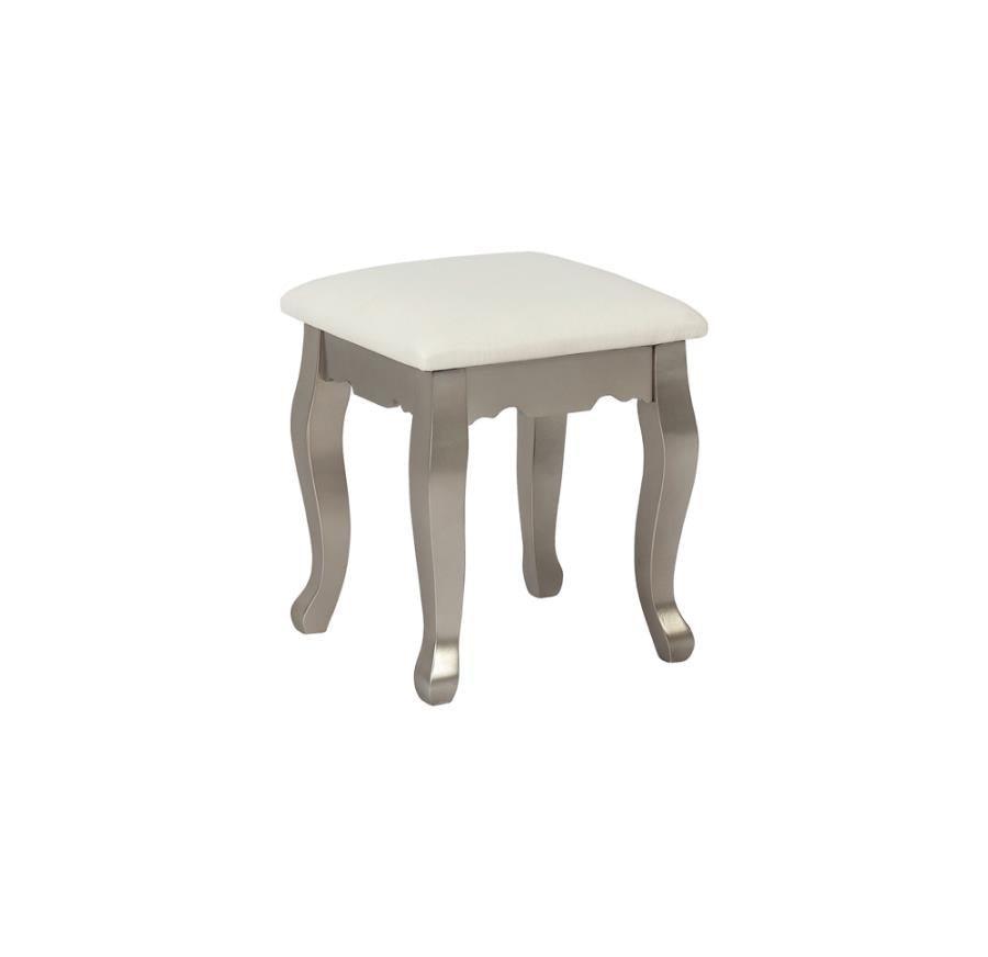 * Glamorous two-piece vanity set in metallic silver finish * Ornate traditional details are glammed up with the metallic finish and crystal hardware * Features an adjustable oval mirror, hutch with two drawers and a shelf atop base with five felt lined drawers * Stool with padded cushion upholstered in white leatherette * Rubberwood, plywood, and MDF construction |